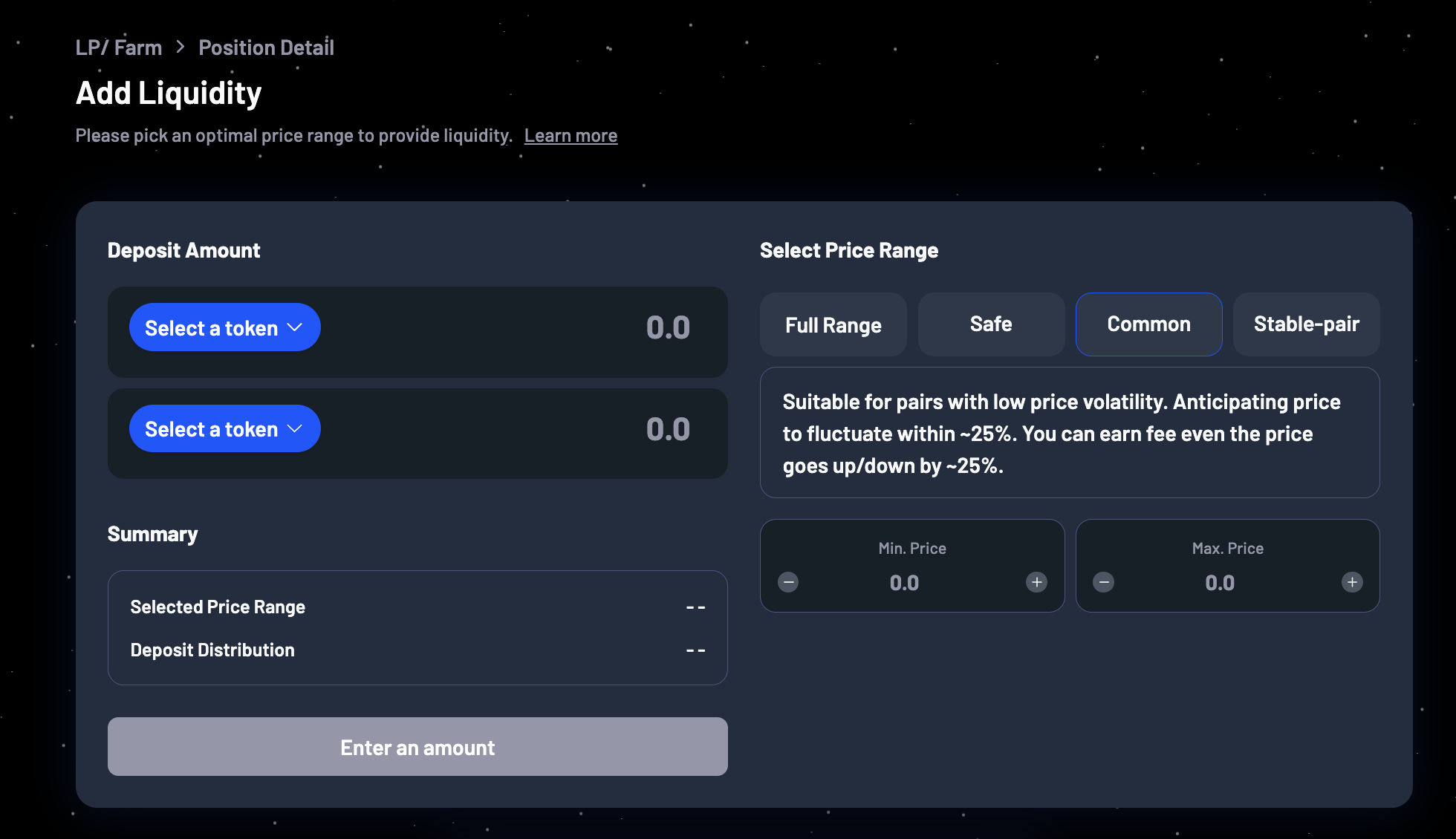 2. Select two tokens that you would like to form pair. The default Price Range is selected for you. If you haven't owned the selected token to your wallet, you will need to register the token to your wallet even if you plan to provide SINGLE token in certain price range.